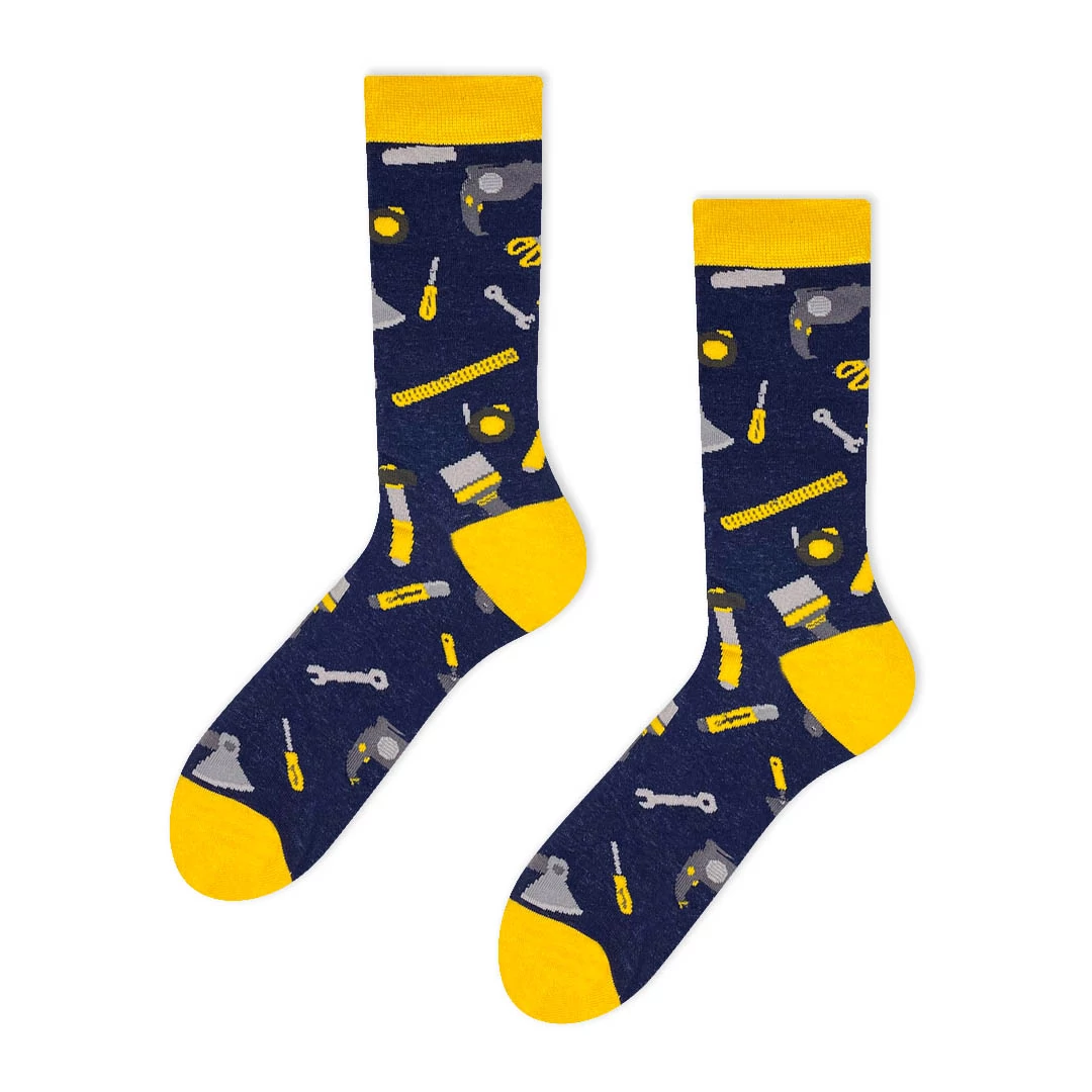 Csavarozás, kalapálás, szerelés? El se indulj, ha nincs rajtad ez a vidám zokni, amin minden elengedhetetlen barkács kellék rajta van. Ezermestereknek kötelező darab.